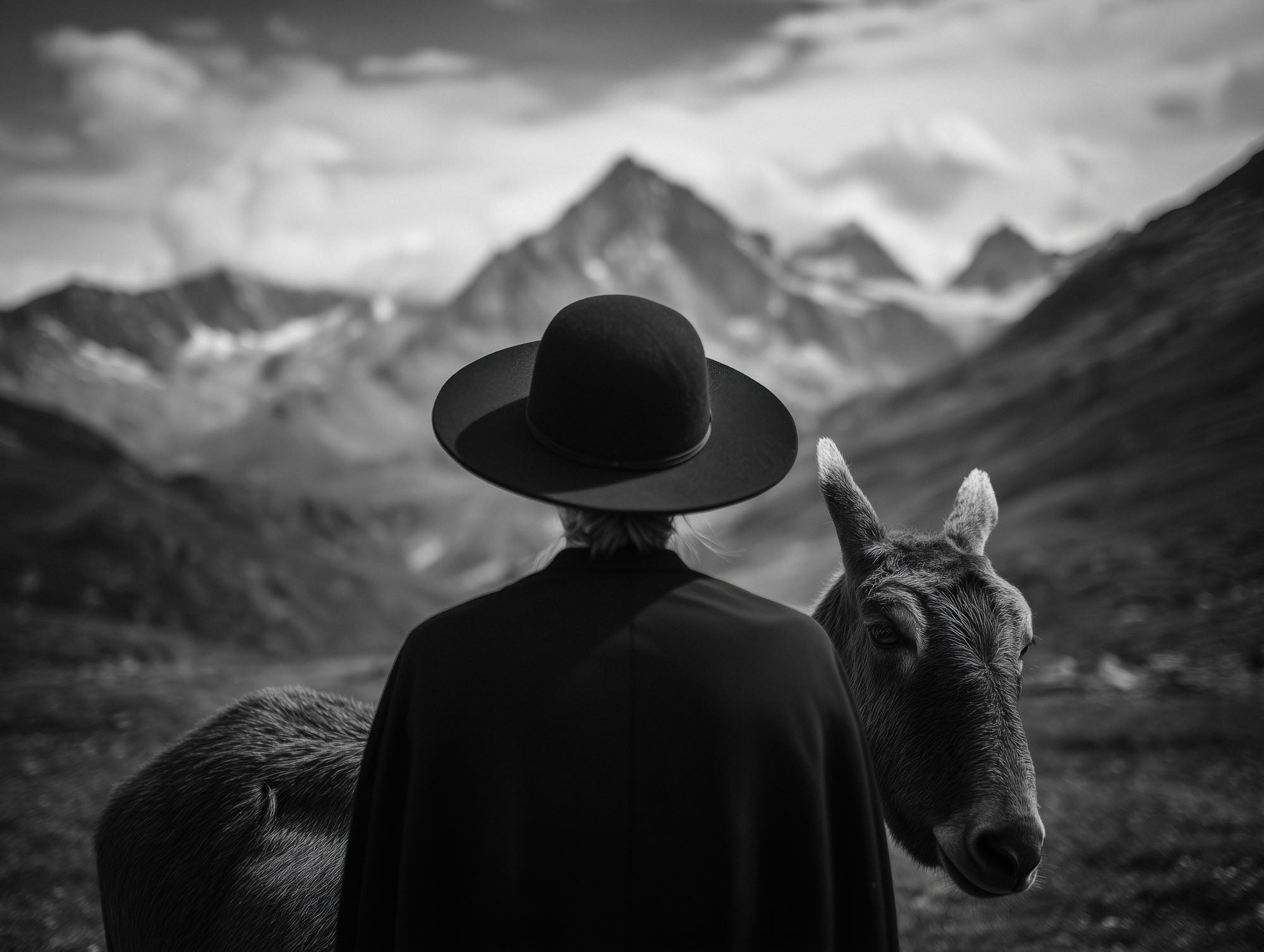 Dieses Kunstwerk fängt einen stillen Moment zwischen einer menschlichen Figur und einem Alpenesel vor der Kulisse der weiten Berglandschaft ein.