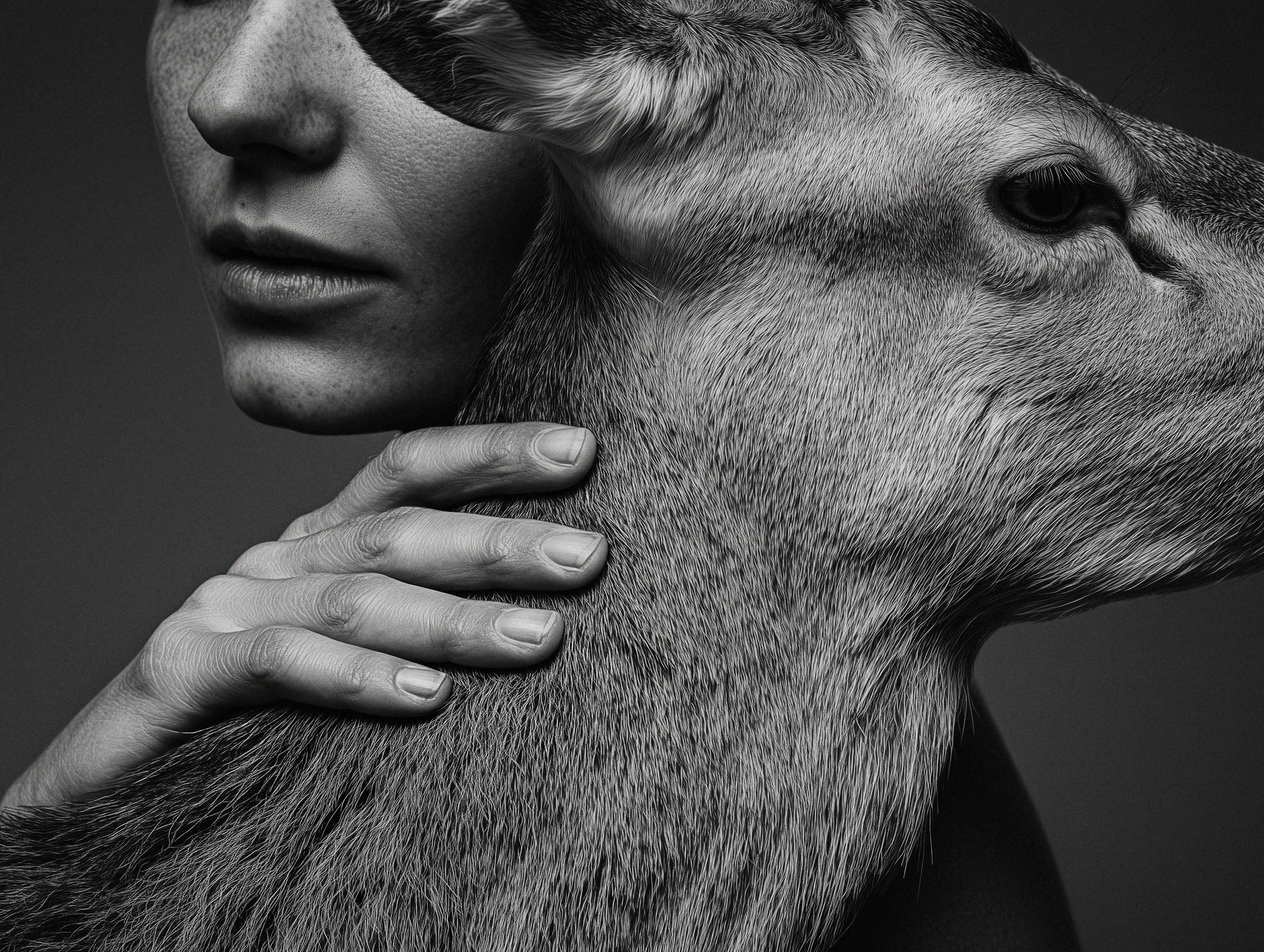 Die sanfte Berührung und die weichen Konturen verschmelzen zu einer einzigen Form, in der Haut und Fell in Stille aufeinandertreffen.