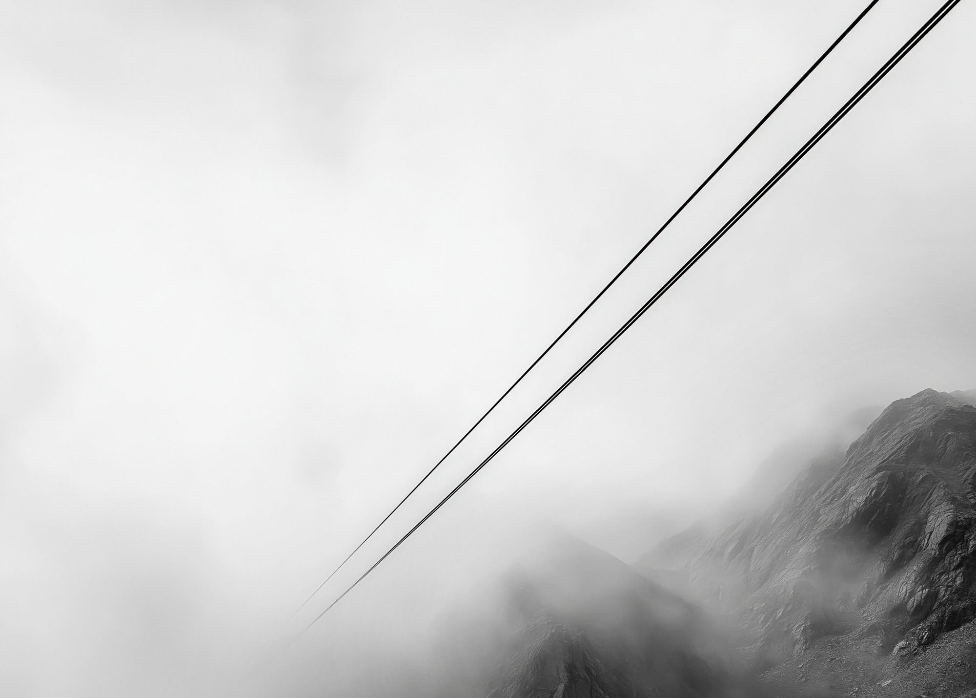 Dieses Kunstwerk fängt die ruhige Geometrie alpiner Seilbahnen ein, die im Nebel verschwinden – ein subtiles Symbol für Bewegung, Verbindung und Dimension.