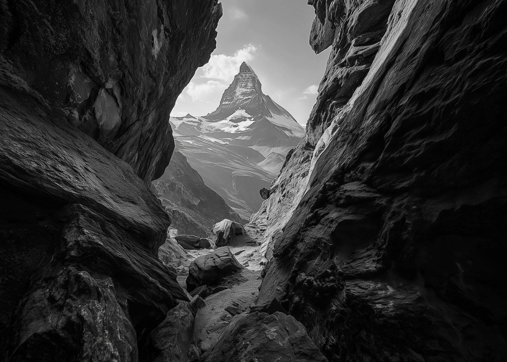 Dieses Kunstwerk fängt einen schmalen, felsigen Durchgang ein, der sich zum Matterhorn hin öffnet, und erzeugt ein starkes Gefühl von Tiefe, Richtung und stiller Erwartung.