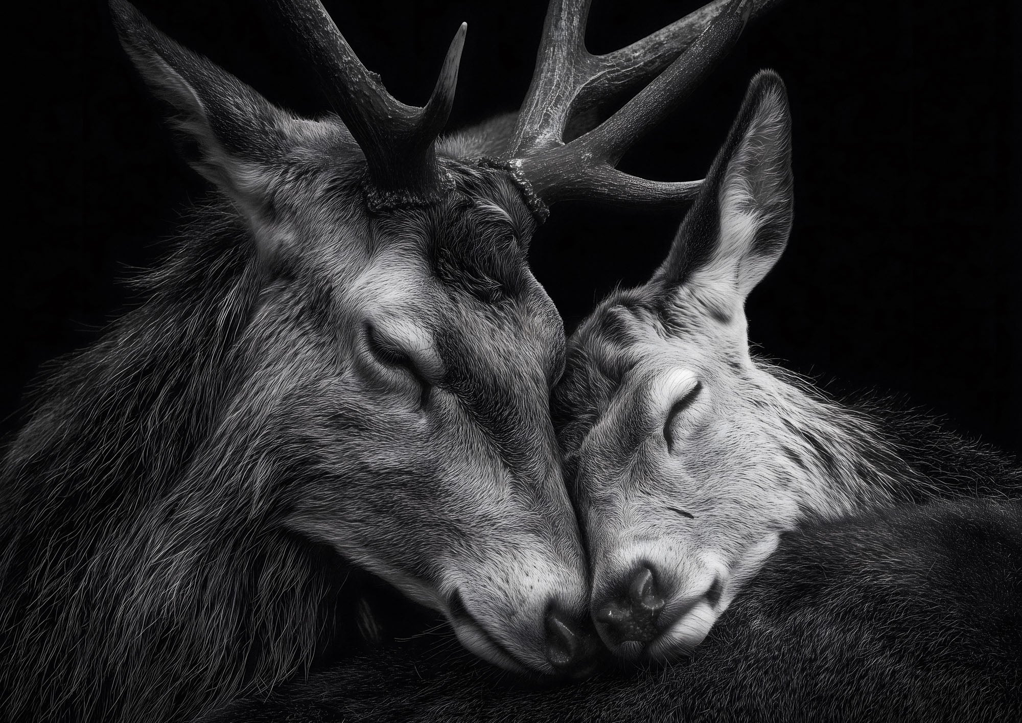 Dieses Kunstwerk fängt einen intimen Moment zwischen zwei Hirschen ein – ein stilles Symbol für Verbundenheit, Vertrauen und Harmonie in der Natur.