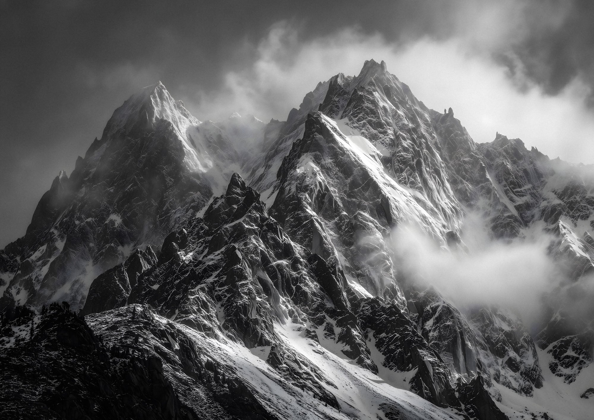 Dieses Kunstwerk fängt die stille Kraft und Erhabenheit der Alpen ein – wo Licht, Schnee und Schatten in perfekter Harmonie aufeinandertreffen.
