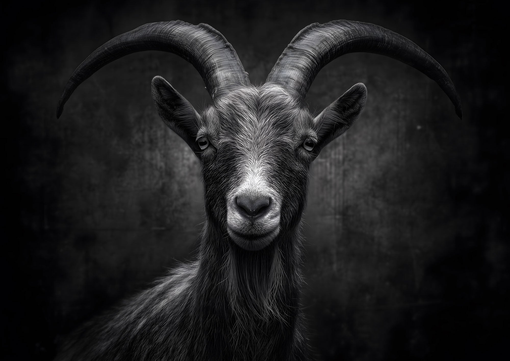 Le contraste saisissant et la lumière douce révèlent chaque détail de ses cornes et de son pelage texturé, créant un portrait à la fois audacieux et serein.