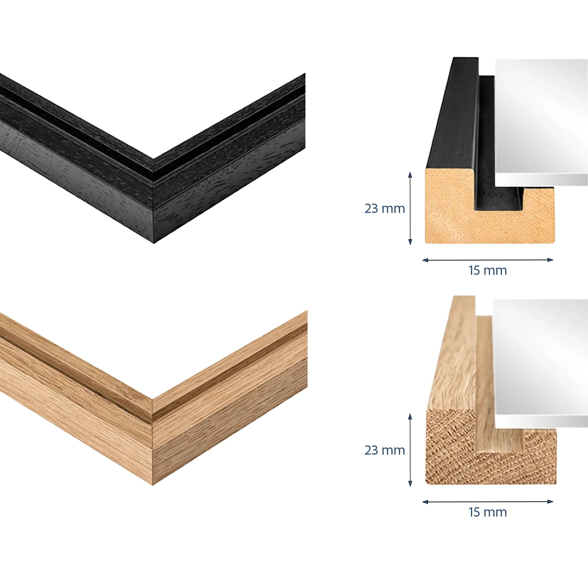 Disponible en finition bois noir ou chêne naturel, chaque cadre présente un espace d'ombre de 15 × 23 mm qui crée un effet flottant raffiné autour de l'œuvre d'art.