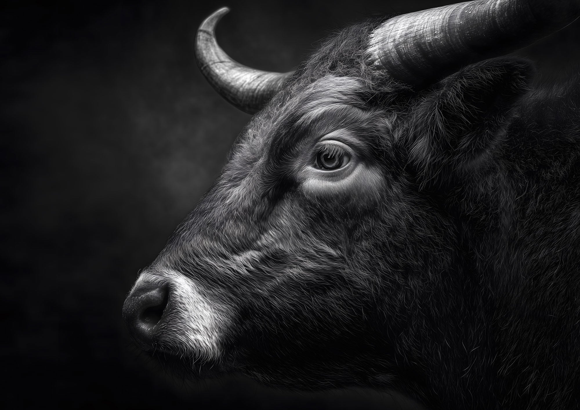 Cette œuvre révèle la puissance tranquille d'un taureau de montagne — symbole de force, de concentration et d'endurance.