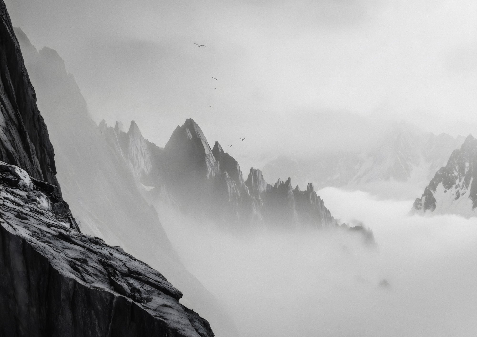 The fine layers of rock and mist create a sense of height and stillness, inviting reflection and balance.