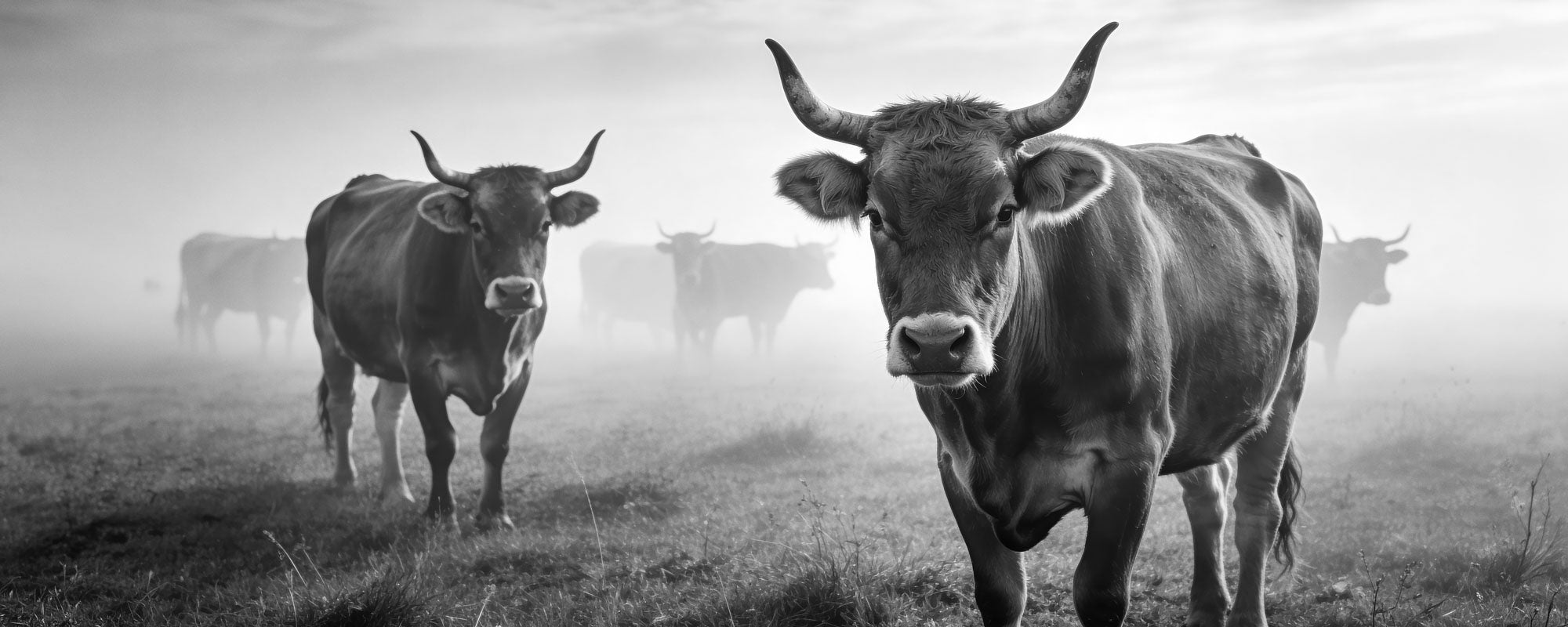 The foggy landscape creates depth and mystery, while the strong horns and calm gaze of the leading cow give the composition a powerful presence. The soft light and monochrome tones highlight the texture of the grass, the animals’ coats, and the peaceful rhythm of life in the mountains.