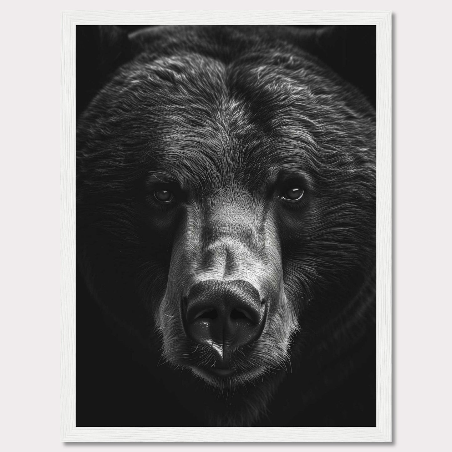 This striking black and white photograph captures the intense gaze of a bear, emphasizing its powerful presence and majestic features. The close-up shot highlights the intricate details of the bear's fur and facial structure, creating a captivating and dramatic effect.