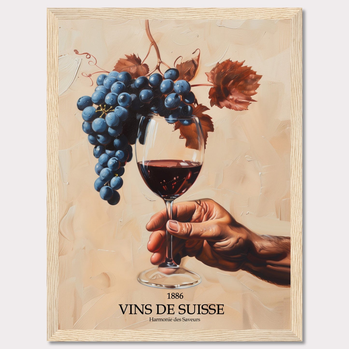 This captivating image showcases a hand holding a glass of red wine, with a luscious bunch of grapes hanging above it. The background is painted in warm, earthy tones, enhancing the rich colors of the grapes and wine.
