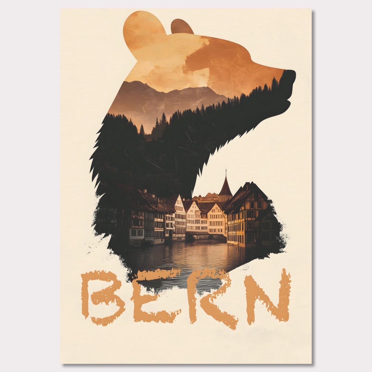 A captivating travel poster that merges Bern’s iconic bear symbol with the city’s historic charm. The silhouette of the bear contains a stunning landscape of alpine forests and traditional Swiss architecture, reflecting the city's rich heritage.