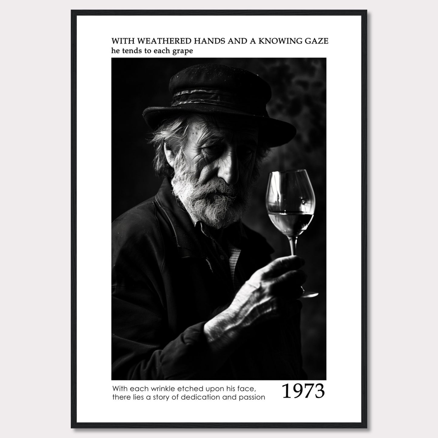 This evocative black-and-white photograph captures an elderly man with a weathered face, holding a glass of wine. His thoughtful gaze and the detailed wrinkles on his face tell a story of dedication and passion. The text accompanying the image reads: "With weathered hands and a knowing gaze he tends to each grape. With each wrinkle etched upon his face, there lies a story of dedication and passion." The year 1973 is prominently displayed.