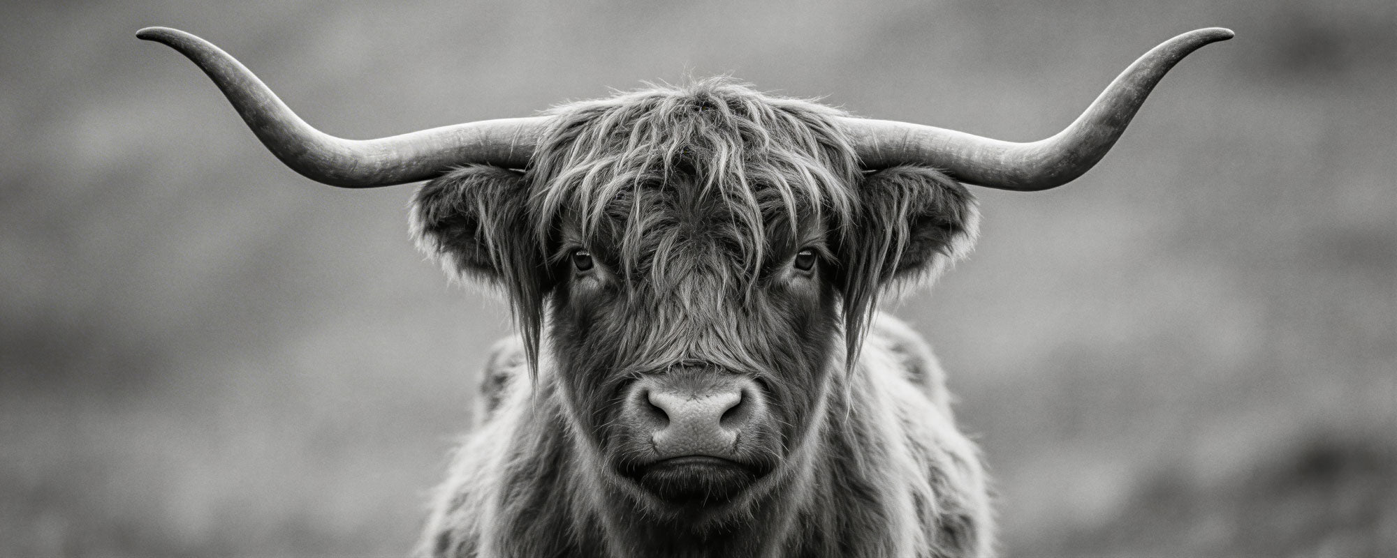 This striking black-and-white wall art captures a Highland cow standing proudly in the alpine landscape. The animal faces the viewer directly, its long horns stretching wide while its thick coat moves softly in the mountain air.