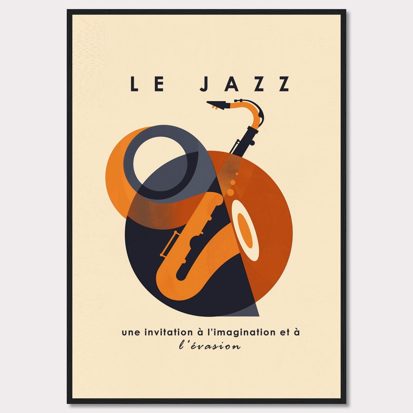 This poster features a stylized saxophone and hat, with overlapping geometric shapes in orange, black, and beige hues. The text reads "LE JAZZ" at the top and "une invitation à l'imagination et à l'évasion" at the bottom. The design evokes a sense of creativity and escape.