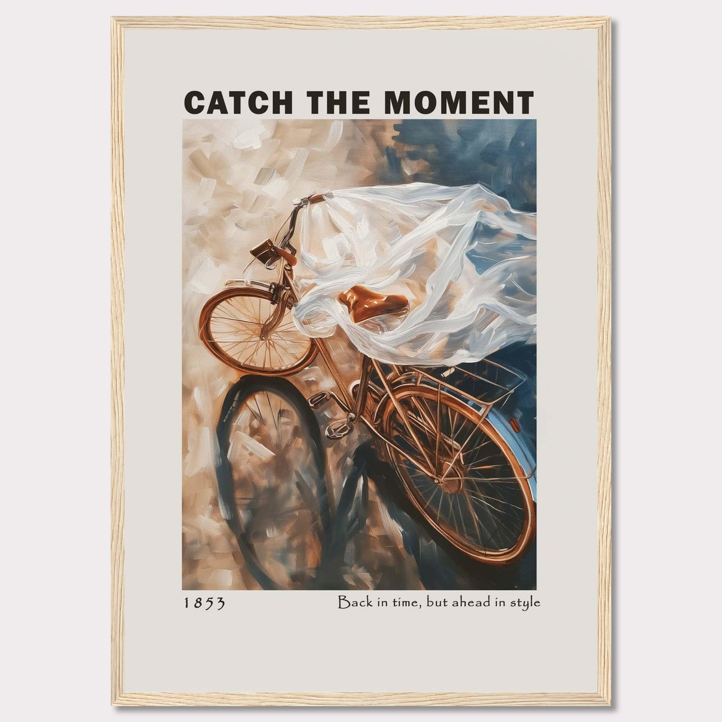 This image features a vintage bicycle draped in a flowing, translucent fabric, creating a sense of motion and nostalgia. The words "CATCH THE MOMENT" are prominently displayed at the top, encouraging viewers to seize opportunities. At the bottom, it reads "1853" and "Back in time, but ahead in style," blending historical charm with modern elegance.
