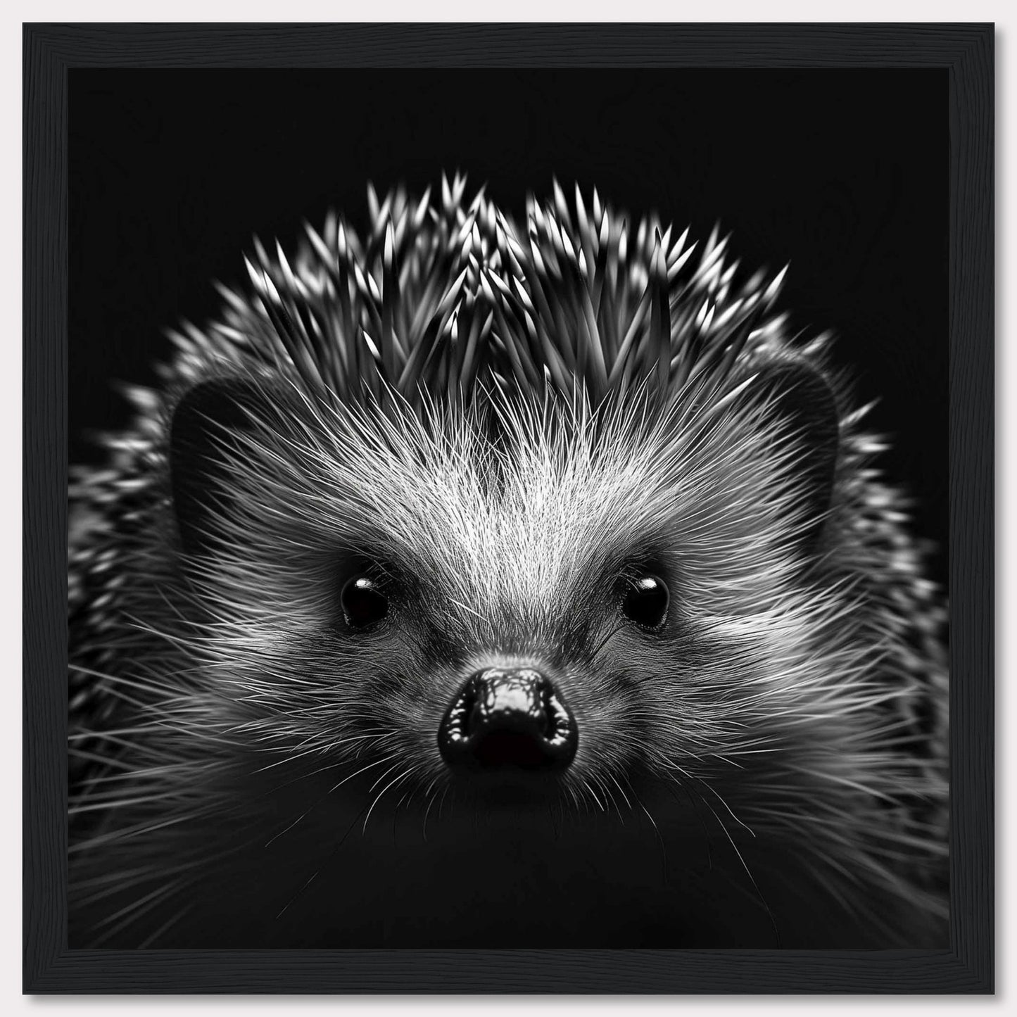 This captivating black and white photograph showcases the adorable face of a hedgehog, with its quills prominently displayed. The close-up shot emphasizes the intricate details of its fur and the curious expression in its eyes.