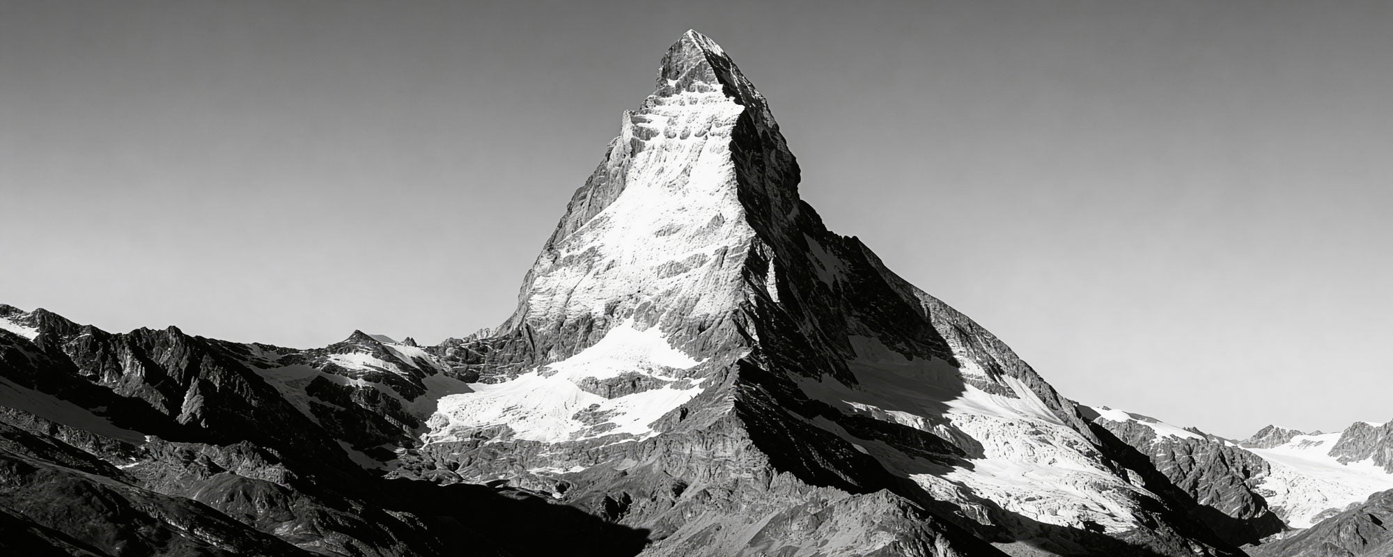 This striking black-and-white wall art captures the iconic silhouette of the Matterhorn rising sharply into a clear alpine sky. The dramatic play of light and shadow emphasizes the mountain’s powerful geometry, steep ridges, and snow-covered slopes, creating a bold and timeless composition.