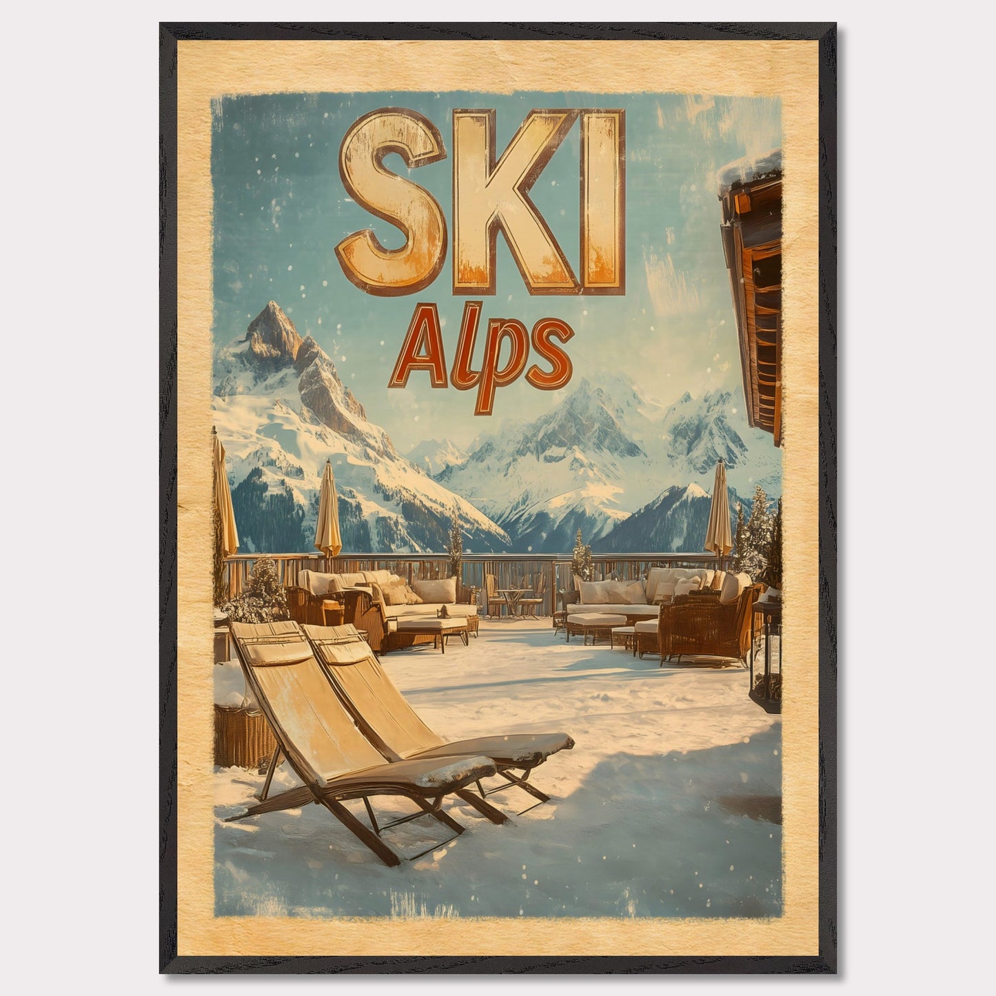 This captivating poster presents a luxurious alpine terrace overlooking majestic snowy peaks. The cozy lounge chairs, wooden railings, and soft golden light create an inviting winter escape. The serene atmosphere and breathtaking views evoke a sense of tranquility and connection to nature.