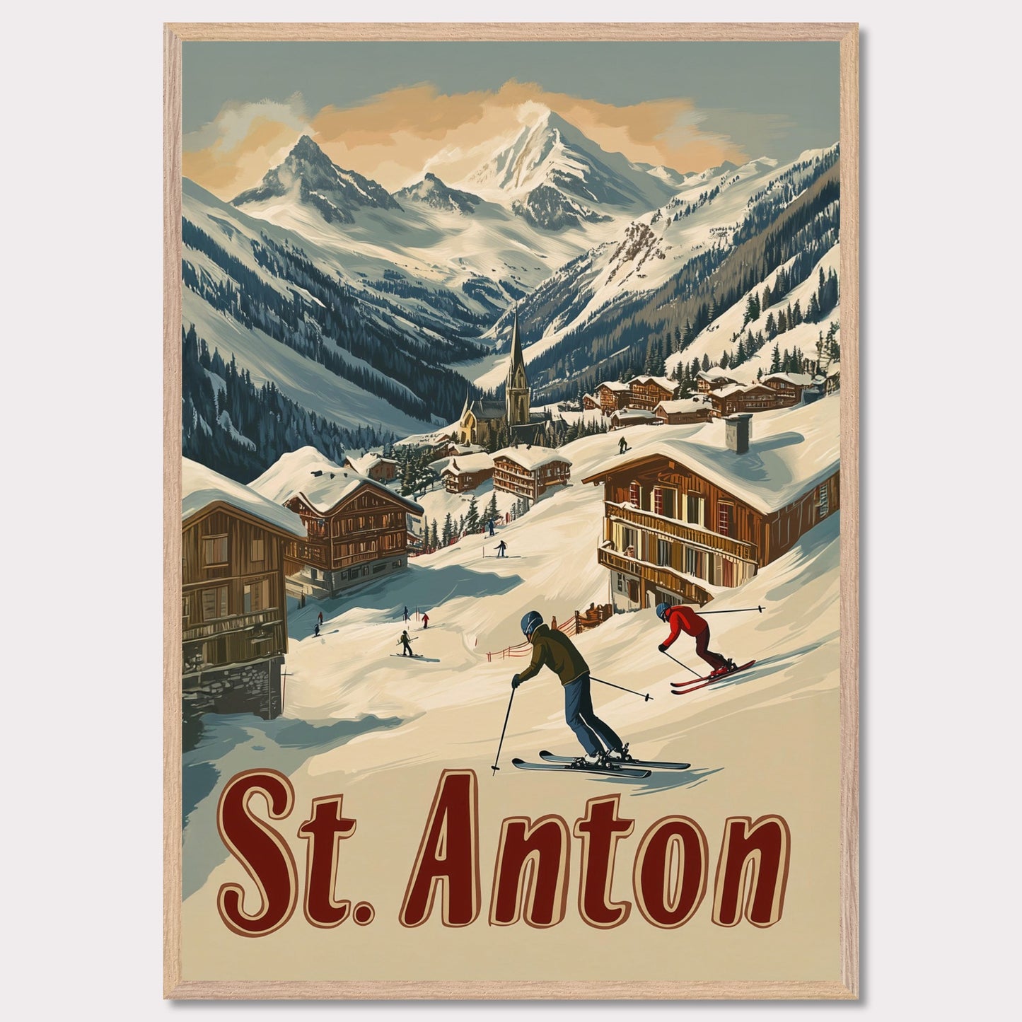 This captivating poster showcases the thrill of skiing in St. Anton, with a group of skiers carving through the fresh powder beneath the dramatic peaks of the Alps. The background features a picturesque village of wooden chalets nestled among the snow, while the rich retro colors and typography emphasize the adventurous spirit of St. Anton as a premier ski destination. The poster evokes both the excitement of the slopes and the warmth of alpine hospitality.