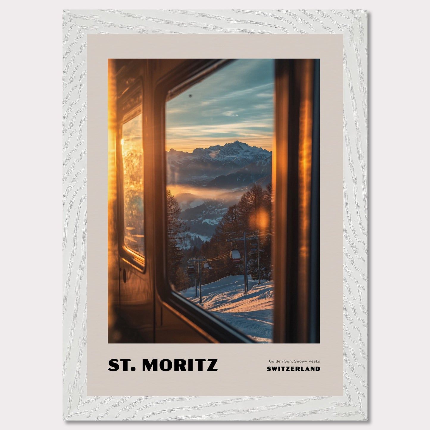 ST. MORITZ. Golden Sun, Snowy Peaks - Wooden Framed Poster