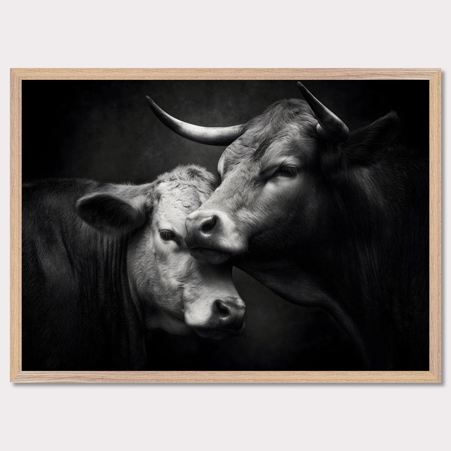 Two cattle stand close, their heads resting tenderly against one another. The soft contact and closed eyes express trust and calm. This monochrome portrait speaks of unspoken bonds — a moment of gentleness and deep connection.