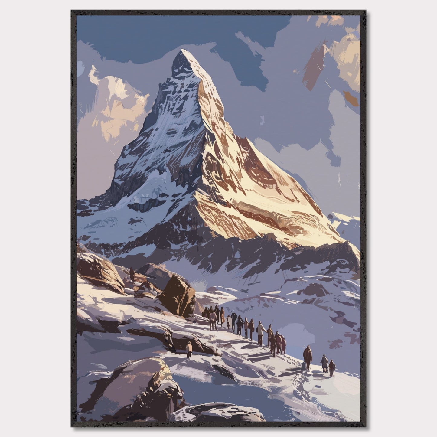Experience the majestic beauty of this stunning mountain landscape. The image captures a group of adventurers trekking up a snow-covered path towards a towering, sunlit peak. The sky above is clear with a few clouds, adding depth and contrast to the scene. The rugged terrain and the determination of the climbers evoke a sense of awe and inspiration.