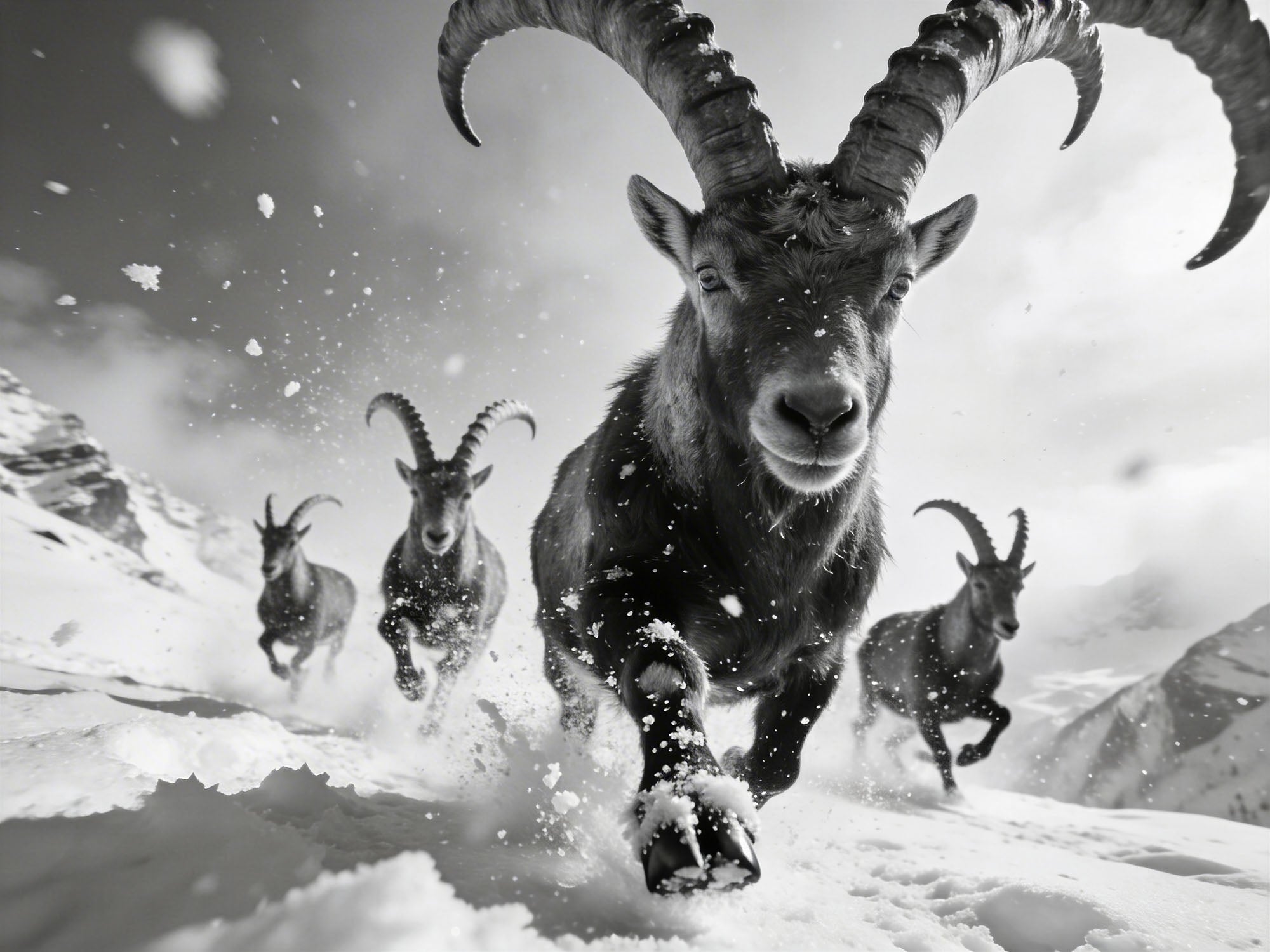 This dynamic black-and-white wall art captures a powerful alpine ibex charging through fresh mountain snow. The massive curved horns and focused gaze create an intense focal point, while the herd running behind adds movement and depth to the composition.