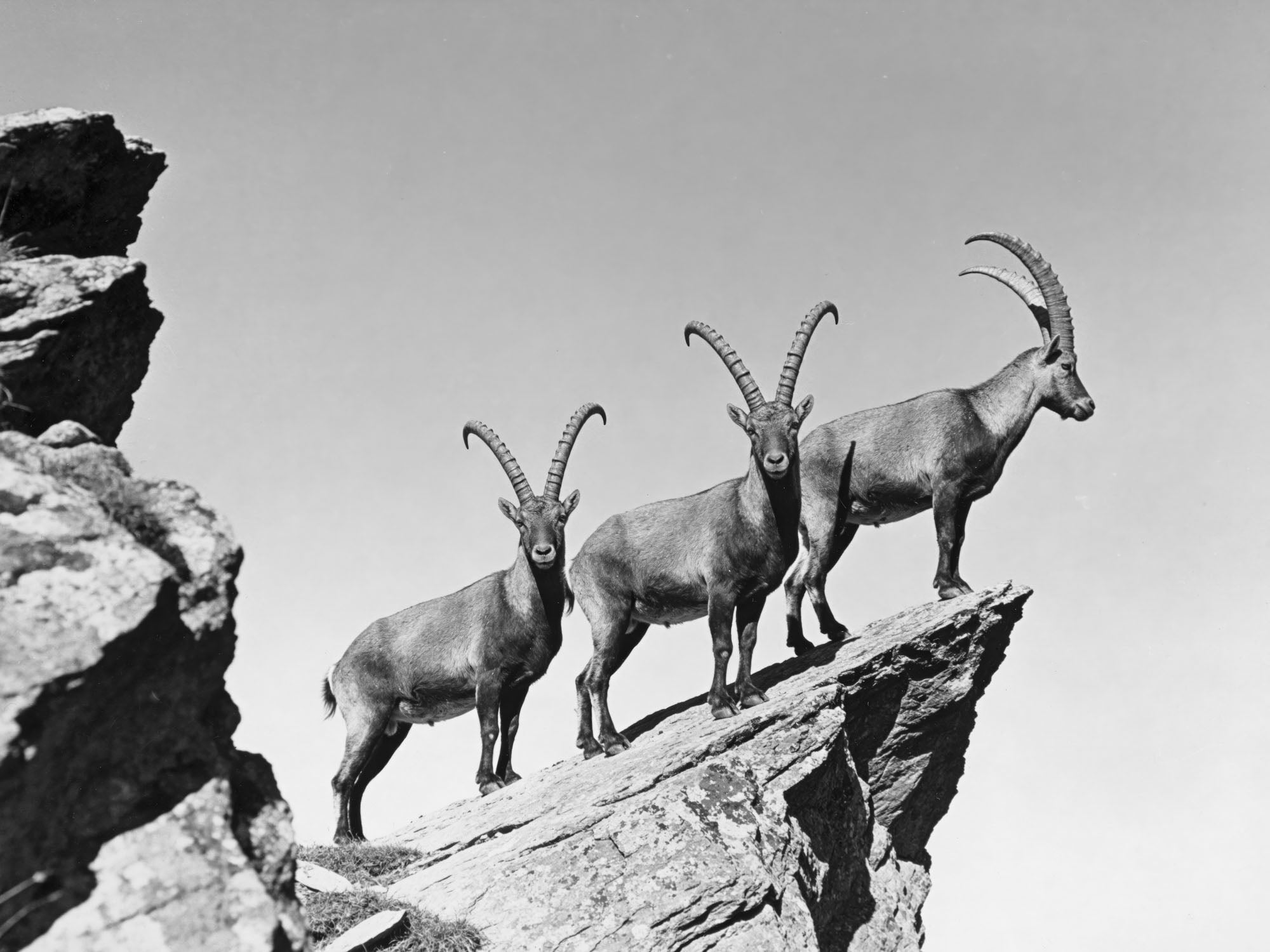 This powerful black-and-white wall art captures three alpine ibex standing confidently on a small rocky peak, rising high above the mountain landscape. Their strong silhouettes and iconic curved horns are set against the open sky, emphasizing elevation and quiet dominance.