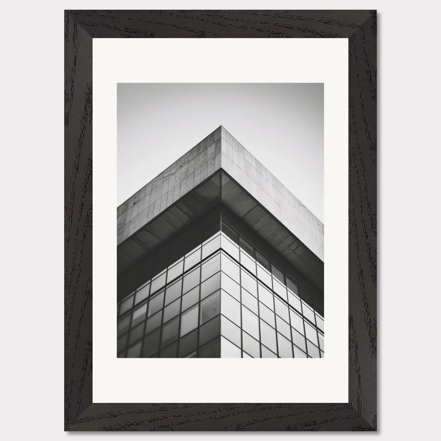 This striking black and white photograph captures the sharp, geometric lines of a modern architectural structure. The image focuses on the corner of a building, emphasizing its sleek glass windows and concrete elements.