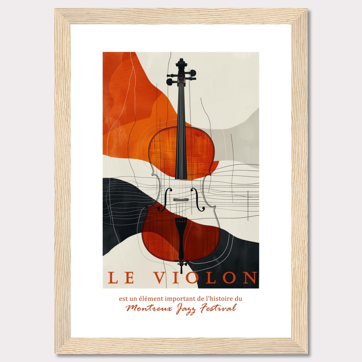 This image features a beautifully designed poster highlighting the importance of the violin in the history of the Montreux Jazz Festival. The central focus is a vibrant, artistic depiction of a violin set against an abstract background of orange, black, and beige shapes.