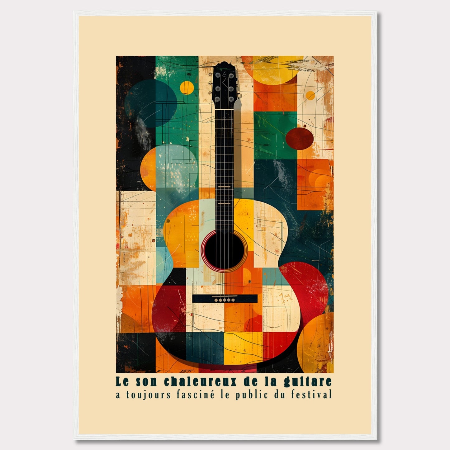 This vibrant artwork features an abstract depiction of an acoustic guitar, blending geometric shapes and bold colors. The French text at the bottom reads, "Le son chaleureux de la guitare a toujours fasciné le public du festival," which translates to "The warm sound of the guitar has always fascinated the festival audience."