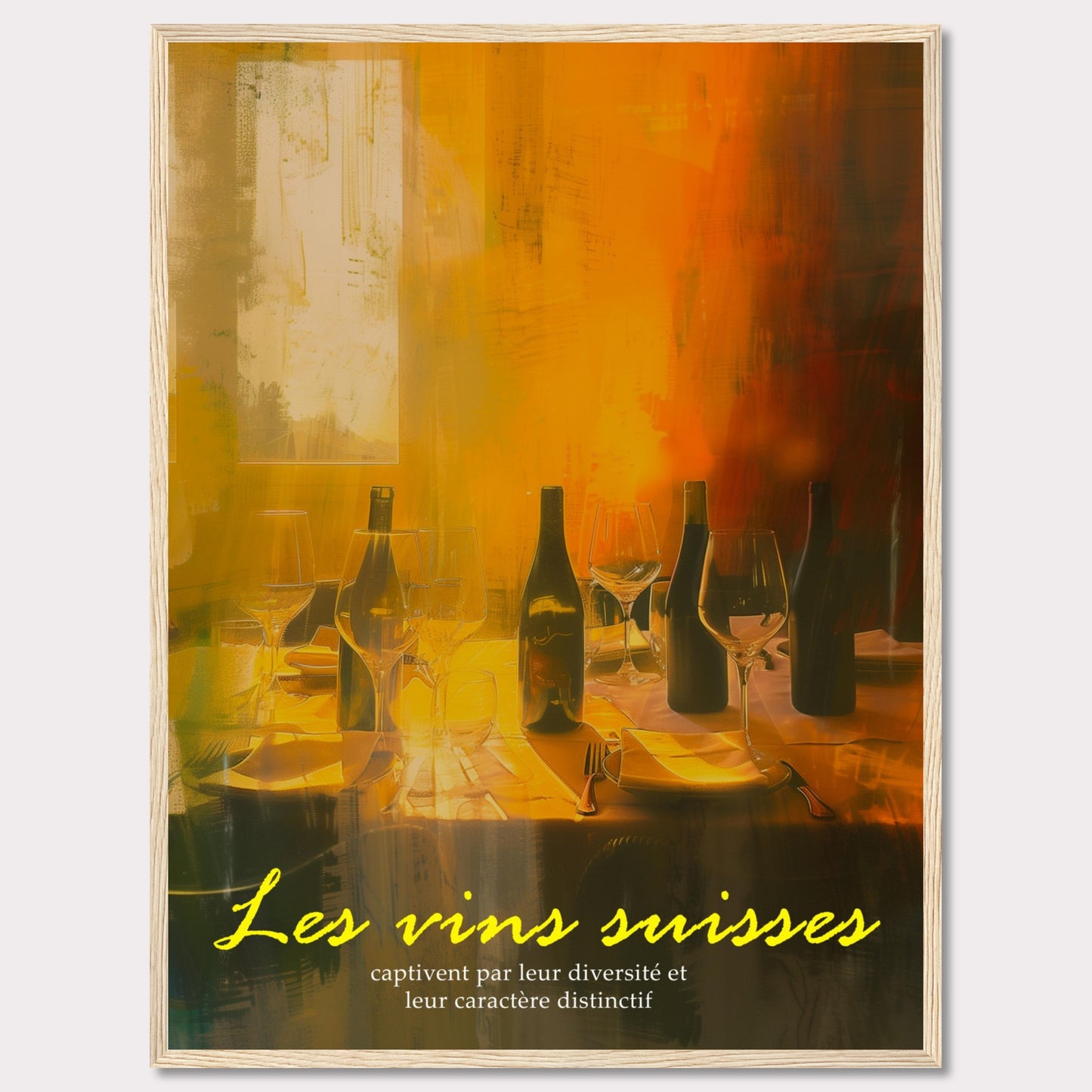 This image showcases a vibrant and inviting scene with Swiss wines elegantly displayed on a table. The warm, golden hues create a cozy and sophisticated atmosphere.