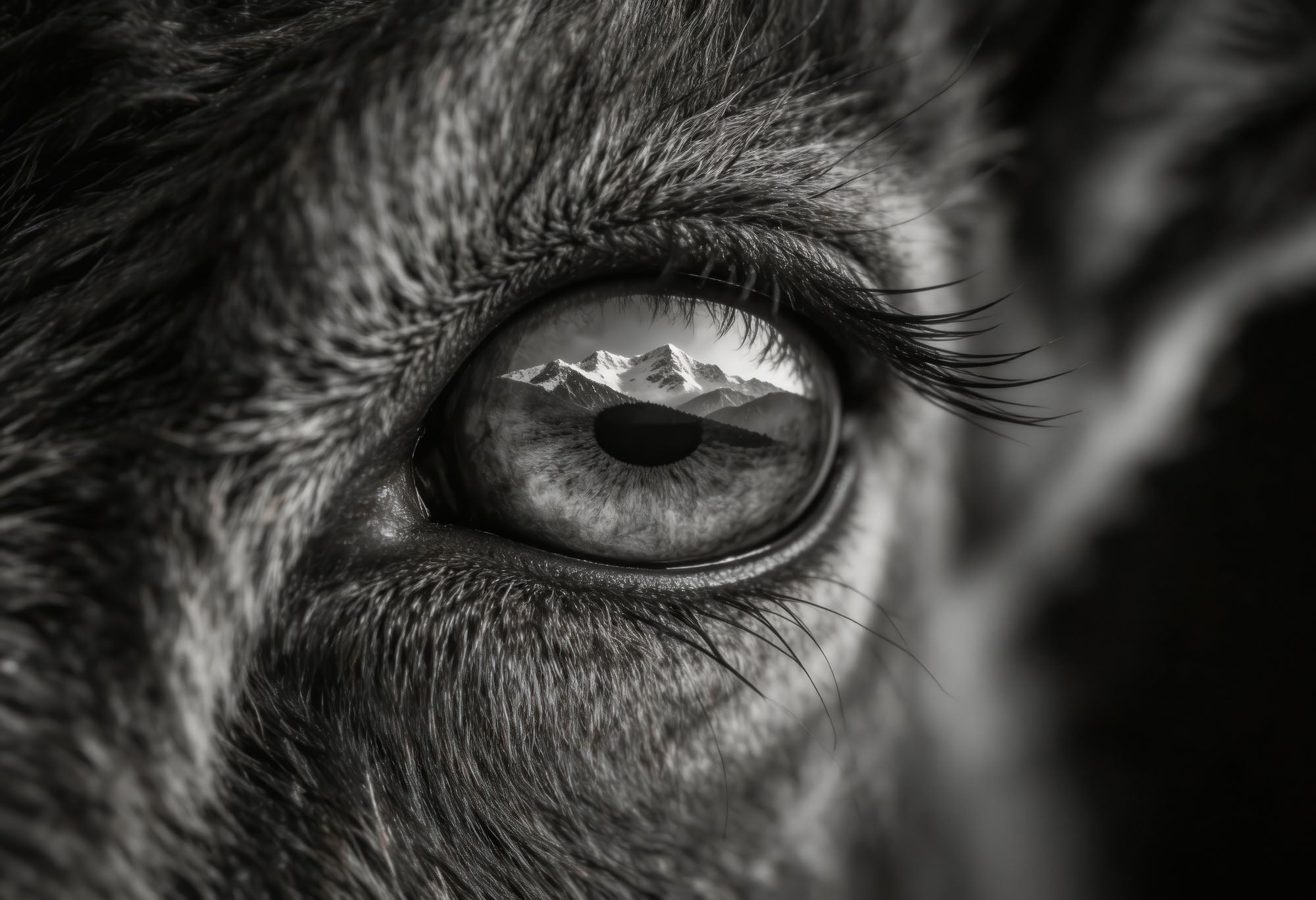 This powerful black-and-white wall art captures an intimate close-up of a wolf’s eye with snow-covered mountains reflected in its gaze. The extreme detail of fur and texture contrasts with the calm alpine landscape mirrored in the iris, creating a striking visual story of instinct and wilderness.