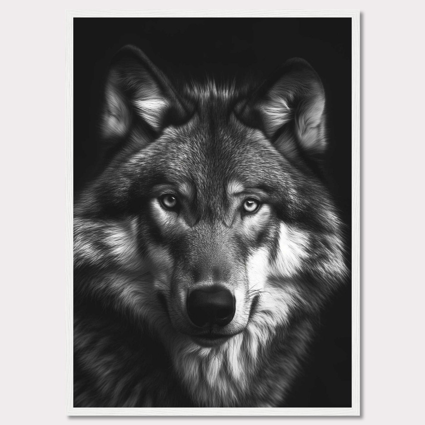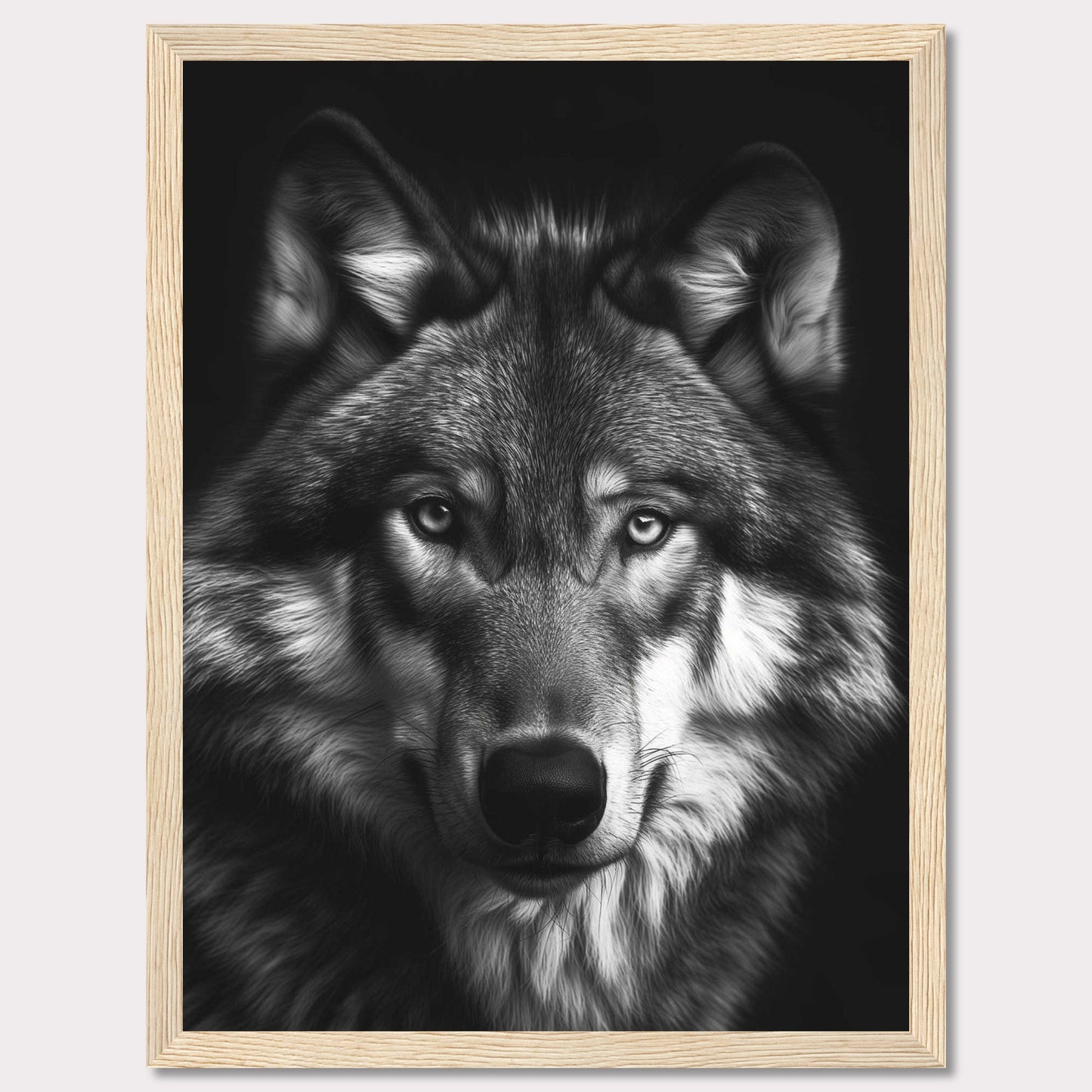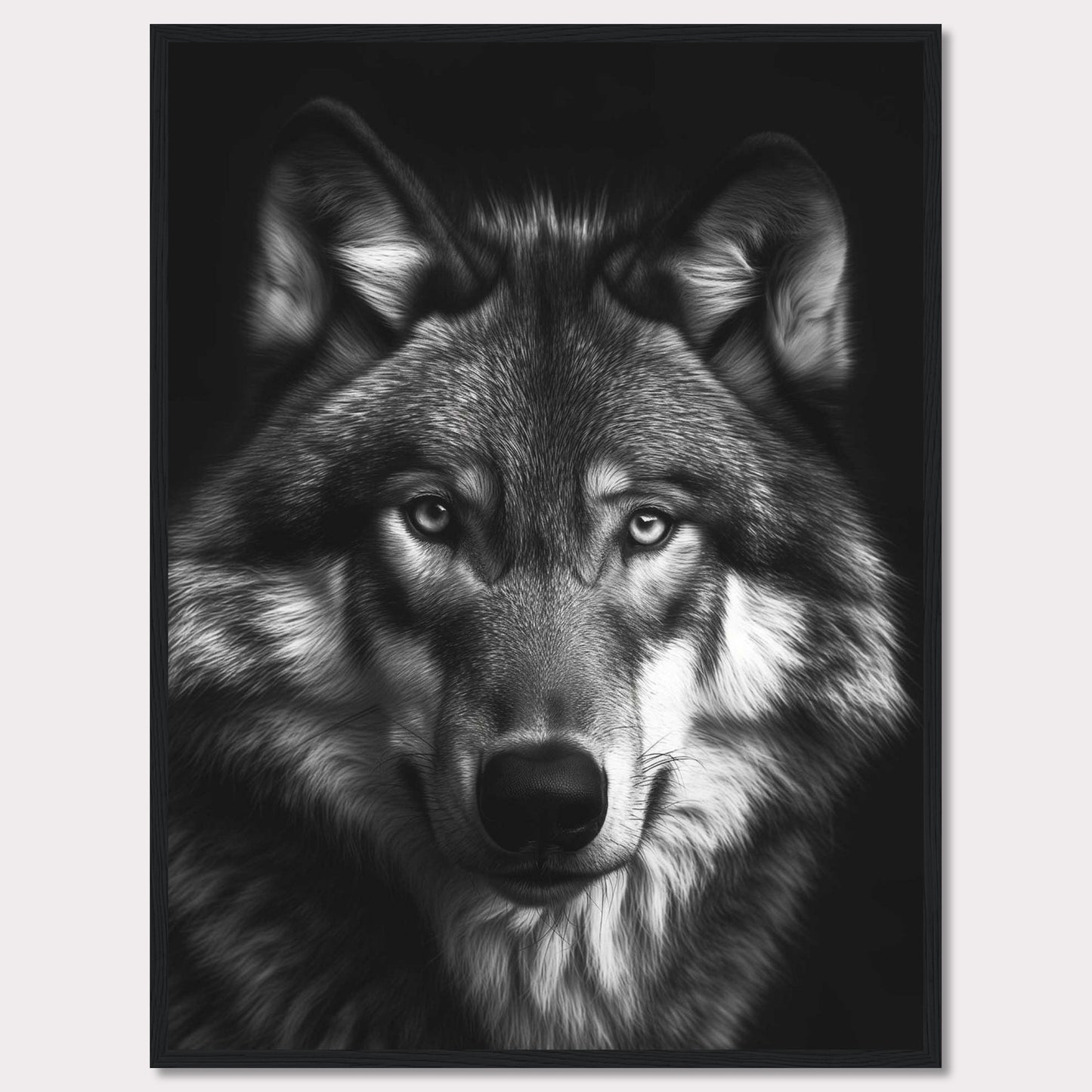 Immerse yourself in the captivating gaze of a majestic wolf with this stunning black and white portrait. The detailed fur, intense eyes, and powerful presence make this artwork a striking addition to any space.
