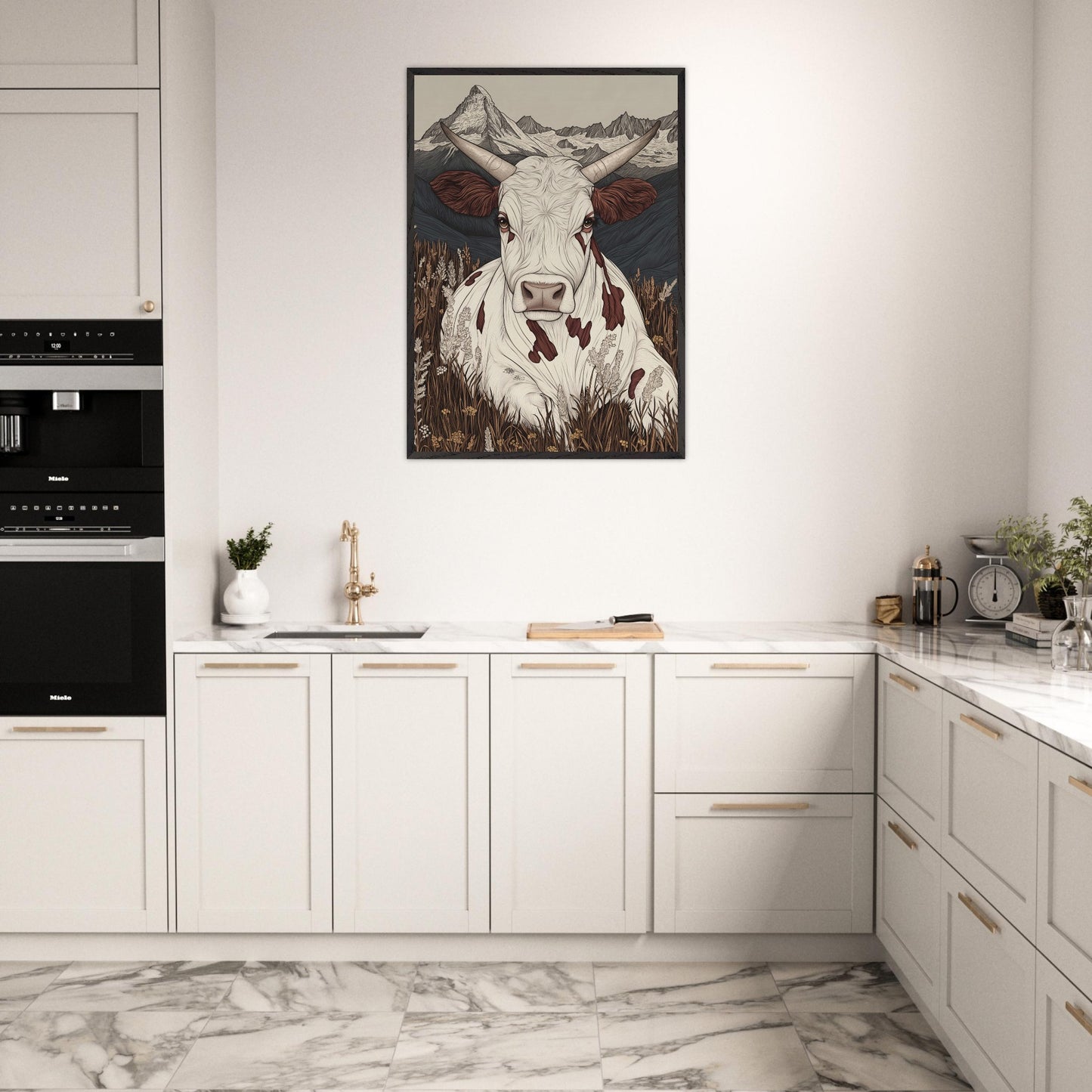 This beautifully detailed poster portrays a tranquil scene of alpine life with a focus on the harmonious connection between nature and animals. A striking cow with intricate features gazes directly at the viewer, creating a sense of intimacy, while the majestic Matterhorn looms in the background. The combination of soft earth tones and delicate linework evokes a rustic yet modern aesthetic.